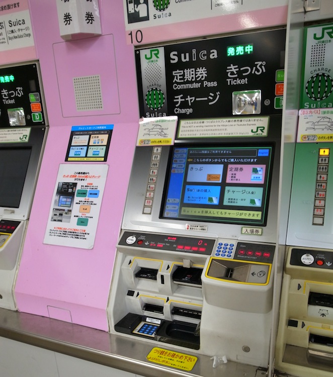 | 在 JR 車站買西瓜卡 (西瓜卡 = 東京八達通) 記住粉紅色售票機才有西瓜卡賣哦 |