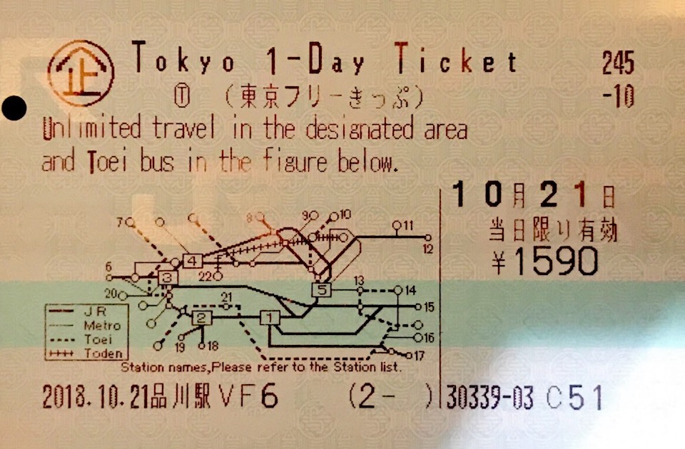 | 在品川駅買 1590 日元的 Tokyo 1-Day Ticket |